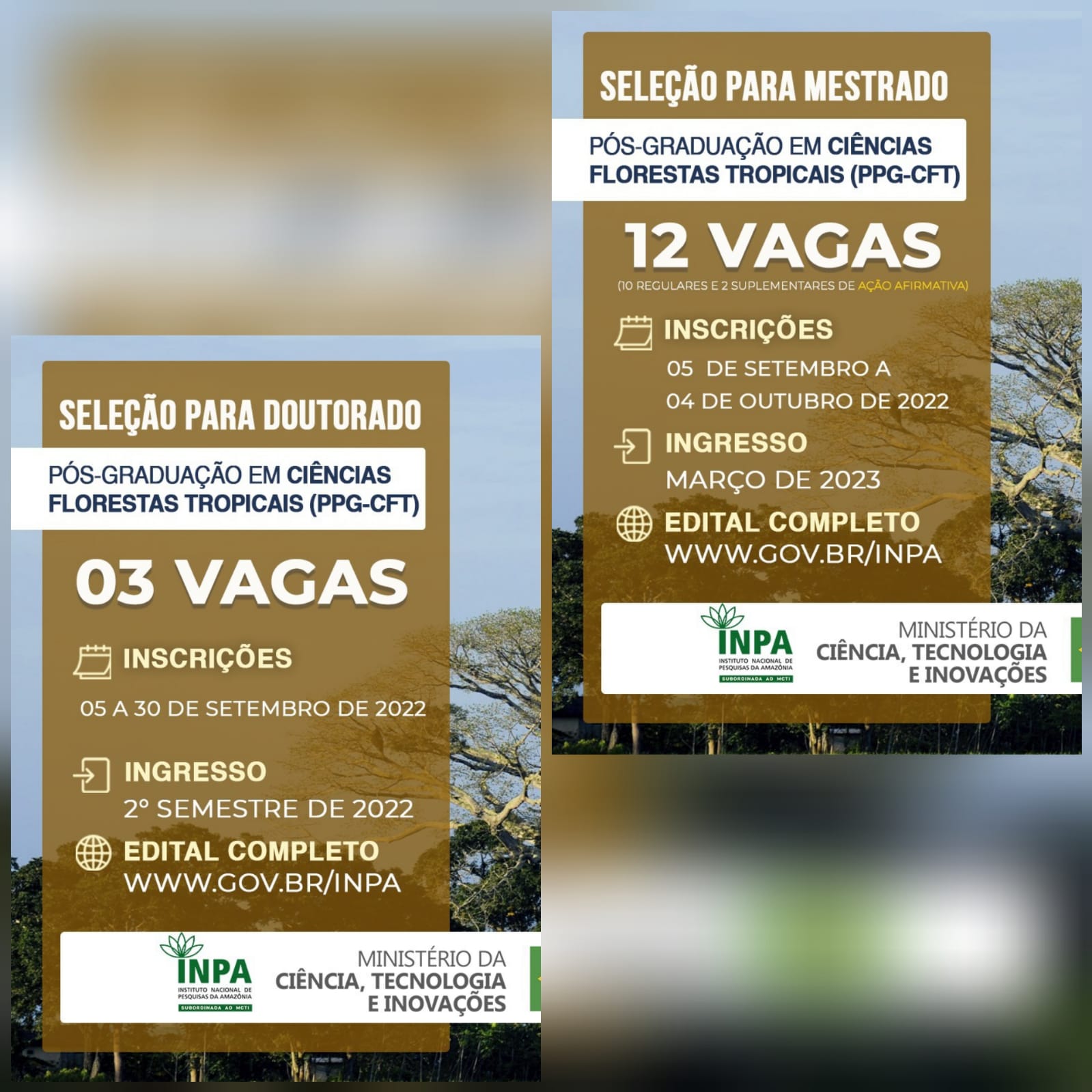 O Programa de Pós-Graduação em Ciências de Florestas Tropicais (PPG-CFT) do Instituto Nacional de Pesquisas da Amazônia (Inpa/MCTI) está com seleção aberta para 15 vagas distribuídas nos cursos de mestrado e doutorado. Conforme os Editais Inpa/Cocap Nº 13/2022 e Inpa/Cocap Nº 14/2022, as inscrições seguem até  04 de outubro para o mestrado, e 30 de setembro para o doutorado. Não há taxa de inscrição.