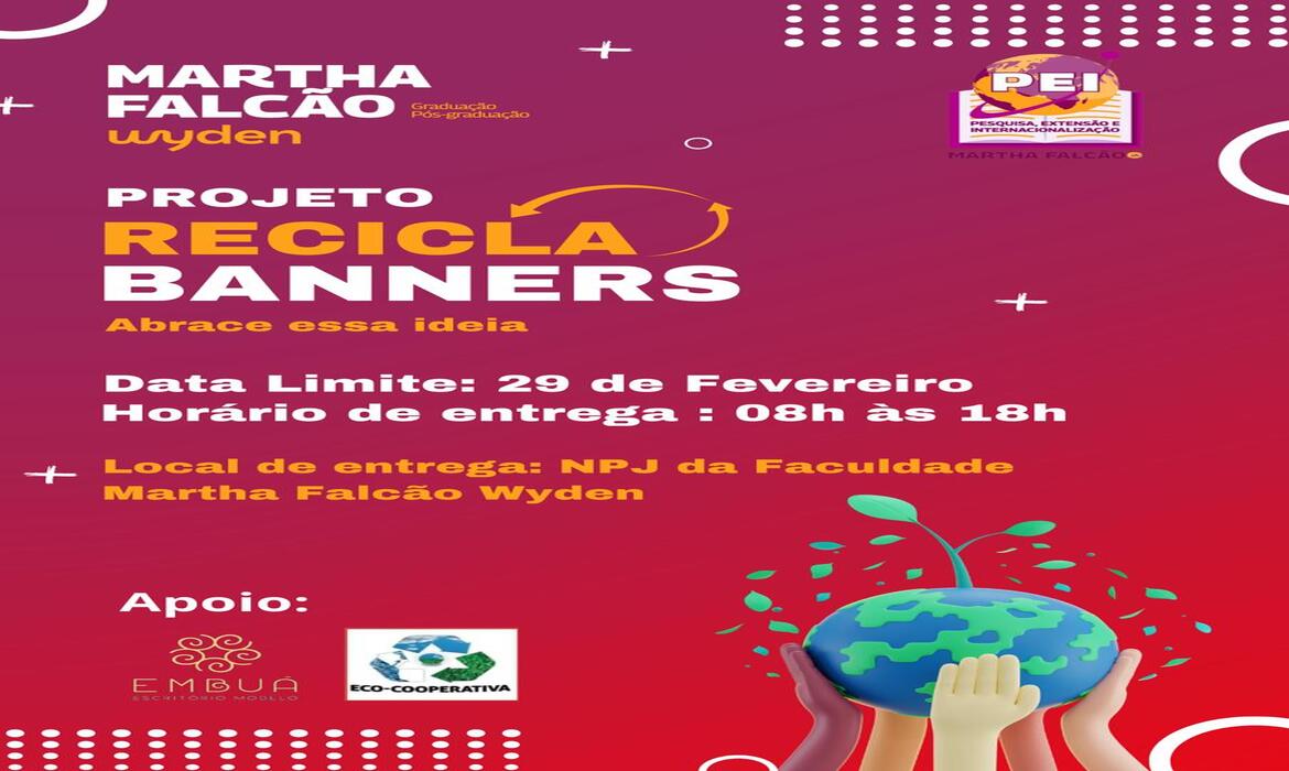 A Faculdade Martha Falcão Wyden realizará nesta quinta-feira (29/02) o projeto “Recicle banners: Abrace essa ideia”, das 8h às 18h, na sede da instituição de ensino, localizada na rua Natal, bairro Adrianópolis, zona centro-sul de Manaus.