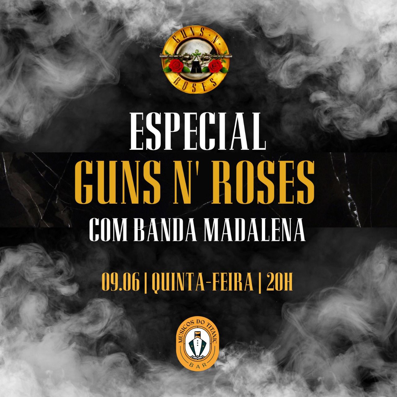 A partir das 20h desta quinta-feira (9/6), o Músicos do Titanic Bar apresenta o Especial Guns N’ Roses com a Banda Madalena.