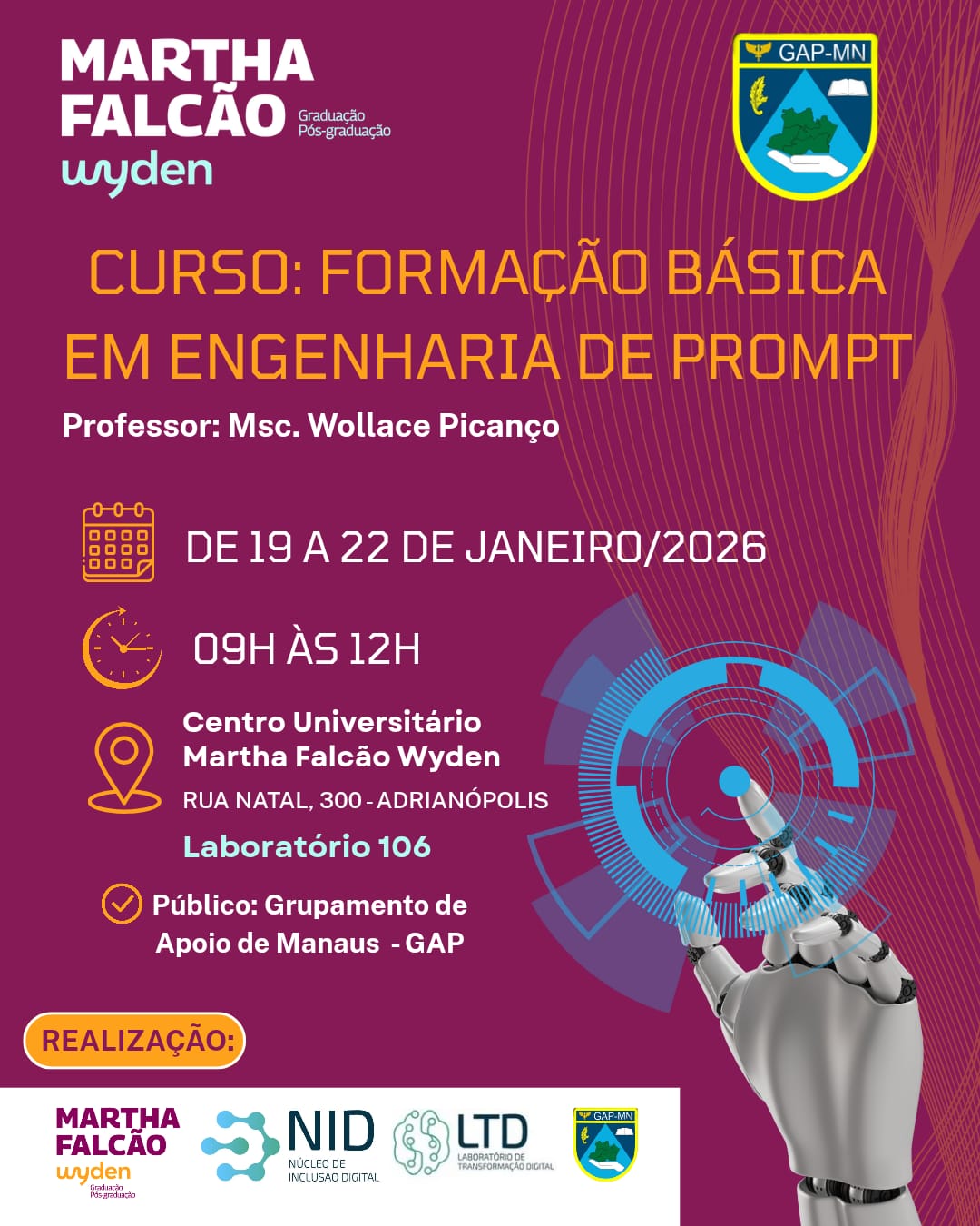 O Centro Universitário Martha Falcão Wyden realiza, entre os dias 19 e 22 de janeiro de 2026, o Curso de Formação Básica em Engenharia de Prompt, voltado ao Grupamento de Apoio de Manaus (GAP-MN). A iniciativa reforça o compromisso da instituição com a inovação, a capacitação tecnológica e a aproximação entre o meio acadêmico e instituições estratégicas da região.