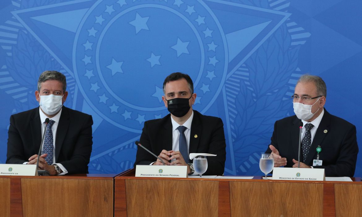 BRASIL – A segunda reunião do Comitê de Coordenação Nacional para Enfrentamento da Pandemia da Covid-19 foi realizada nesta manhã, no Palácio do Planalto, em Brasília. Após participar da reunião, o ministro da Saúde, Marcelo Queiroga, o presidente do Senado, Rodrigo Pacheco, e o deputado federal Dr. Luizinho (PP-RJ) concedem entrevista coletiva para falar sobre os resultados das discussões.